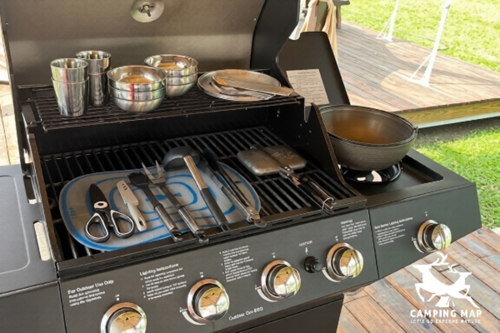 炊事設備:4人餐桌椅、鍋具、三件組廚具及餐具、每四帳提供1個直立型燒烤爐,請愛惜使用勿刮傷。